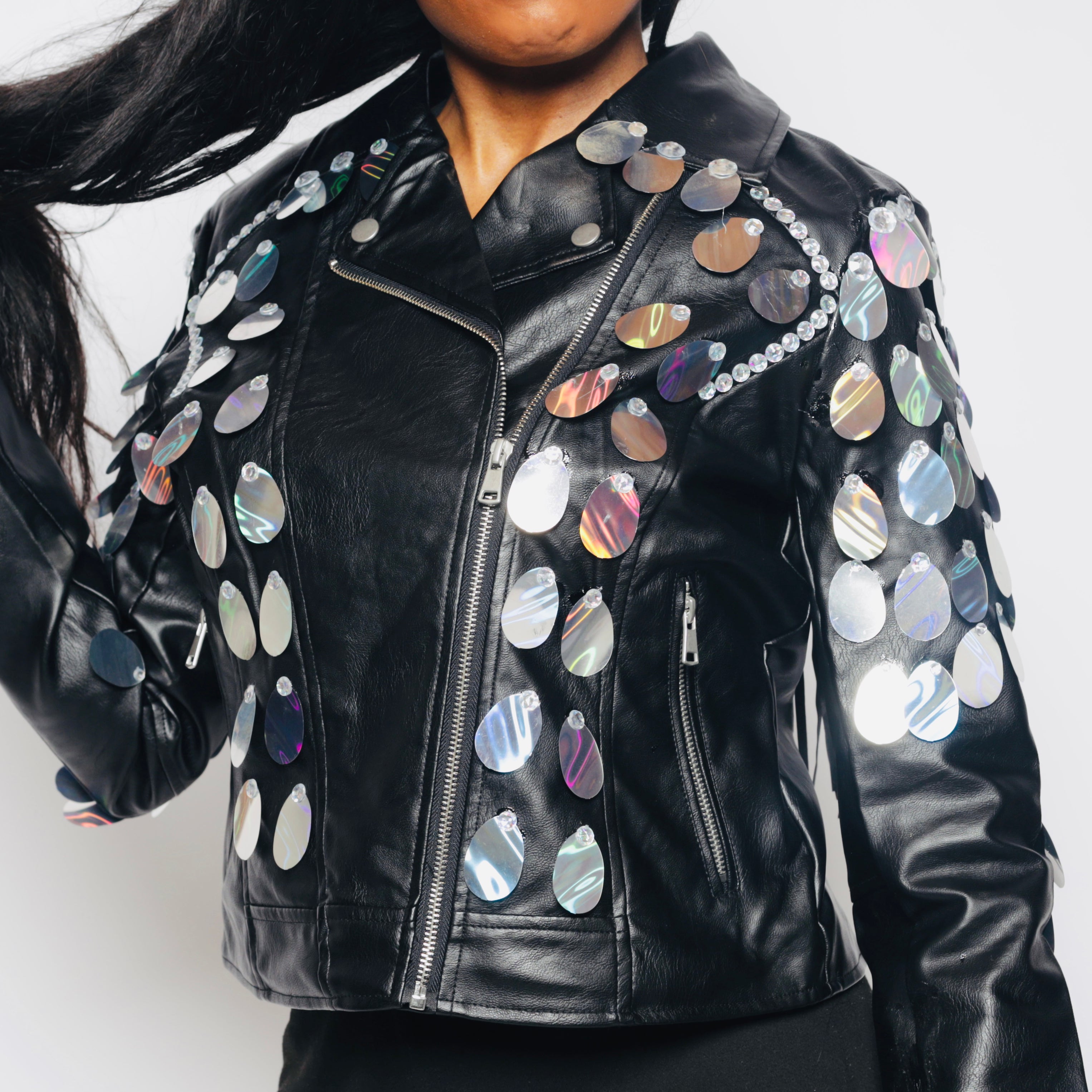 Turn heads with our Custom Handmade Silver Fringe Jacket, crafted for those who love to make a statement! ✨ This biker-style jacket features dazzling silver sequin embellishments, mirror disc details, and a stunning fringe back that adds a touch of drama. The sleek black faux leather base provides the perfect contrast, creating an edgy yet glamorous look.